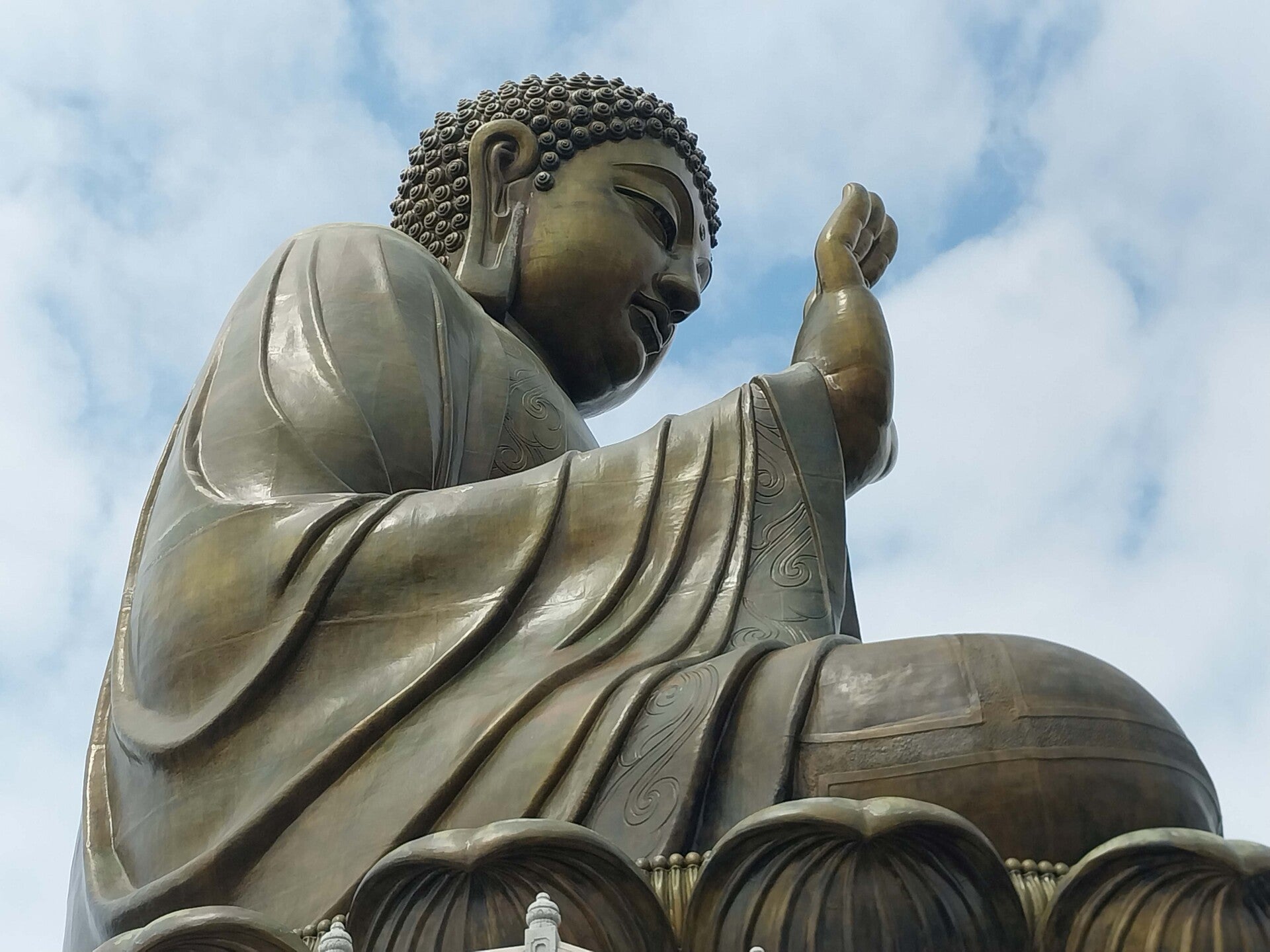 Our final full day was spent going to Lantau Island to visit the Big Buddha. We’d been impressed by the ease with which we’d been able to use the bus, train and ferry systems. We were able to buy an “elders” travel card, because we are “old” , without the need for ID. The signage, all in English, made it easy for us to get about. We even had a go in one of the iconic skinny trams – which I think look like the night buses in the Harry Potter films. So getting to Lantau Island by train was easy. We took the gondola up the mountainside to the religious site – temples, worshippers, the giant Buddha and more souvenir shops than you can shake a stick at! It was all very impressive, the golden Buddha, the beautiful temple, the swept pavements, the flowers and incense, the tranquillity, despite the crowds.